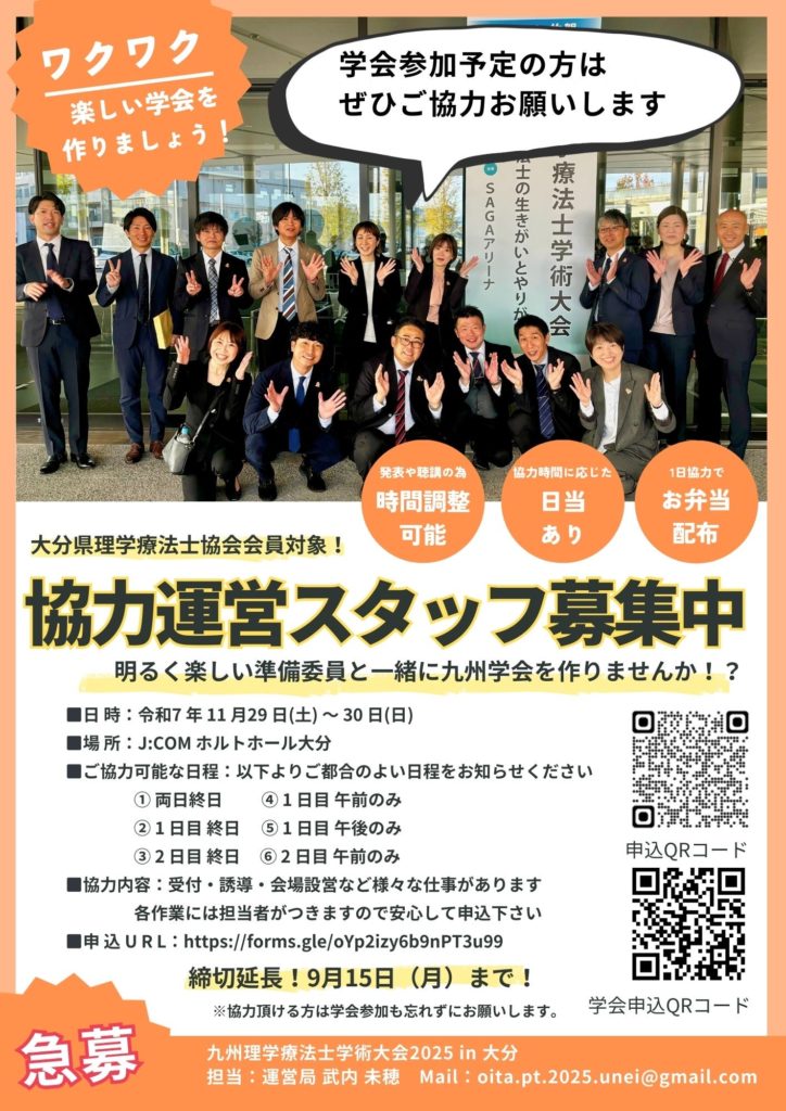 「九州理学療法士学術大会2025 in 大分」の開催まで、いよいよ3か月となりました。現在、大会運営を支えていただく協力スタッフを大分県会員の皆さまから広く募集しております。